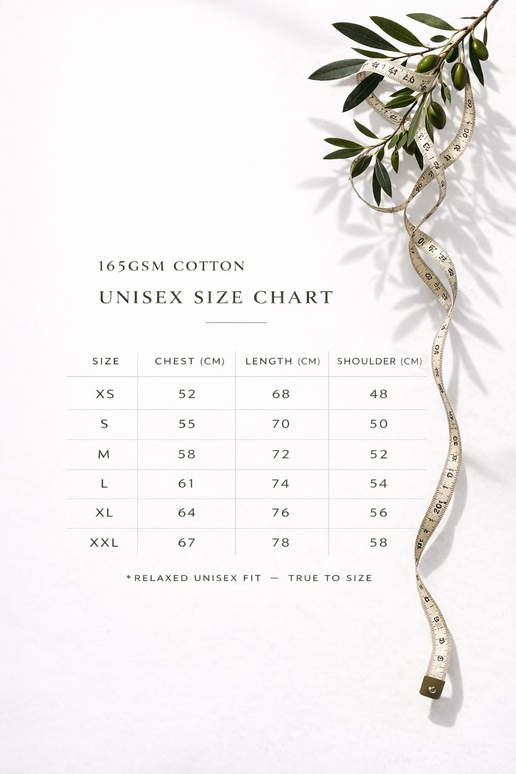 165 gsm premium combed cotton, selected for its softness, breathability and natural structure.